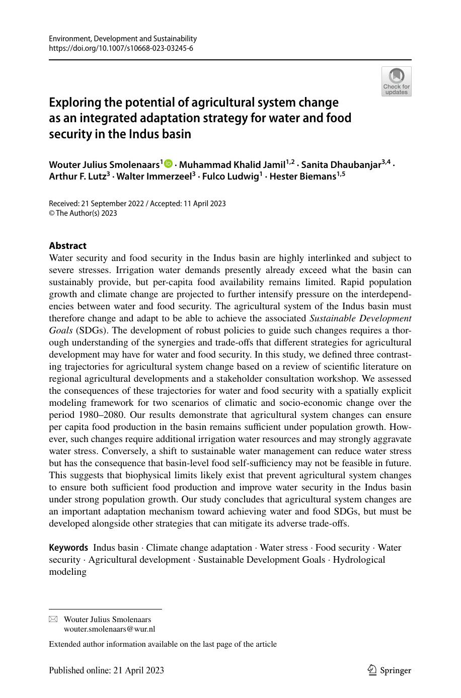 Water security and food security in the Indus basin are highly interlinked and subject to severe stresses. Irrigation water demands presently already exceed what the basin can sustainably provide, but per-capita food availability remains limited. Rapid population growth and climate change are projected to further intensify pressure on the interdependencies between water and food security. The agricultural system of the Indus basin must therefore change and adapt to be able to achieve the associated Sustainable Development Goals (SDGs). The development of robust policies to guide such changes requires a thorough understanding of the synergies and trade-offs that different strategies for agricultural development may have for water and food security. In this study, we defined three contrasting trajectories for agricultural system change based on a review of scientific literature on regional agricultural developments and a stakeholder consultation workshop. We assessed the consequences of these trajectories for water and food security with a spatially explicit modeling framework for two scenarios of climatic and socio-economic change over the period 1980-2080. Our results demonstrate that agricultural system changes can ensure per capita food production in the basin remains sufficient under population growth. However, such changes require additional irrigation water resources and may strongly aggravate water stress. Conversely, a shift to sustainable water management can reduce water stress but has the consequence that basin-level food self-sufficiency may not be feasible in future. This suggests that biophysical limits likely exist that prevent agricultural system changes to ensure both sufficient food production and improve water security in the Indus basin under strong population growth. Our study concludes that agricultural system changes are an important adaptation mechanism toward achieving water and food SDGs, but must be developed alongside other strategies that can mitigate its adverse trade-offs.
